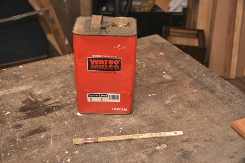 仕上げに使うのはワトコオイル。彫刻刀で掘った溝にオイルが入り込むと立体的な印象に仕上がる。刷毛は少し小さめを用意。