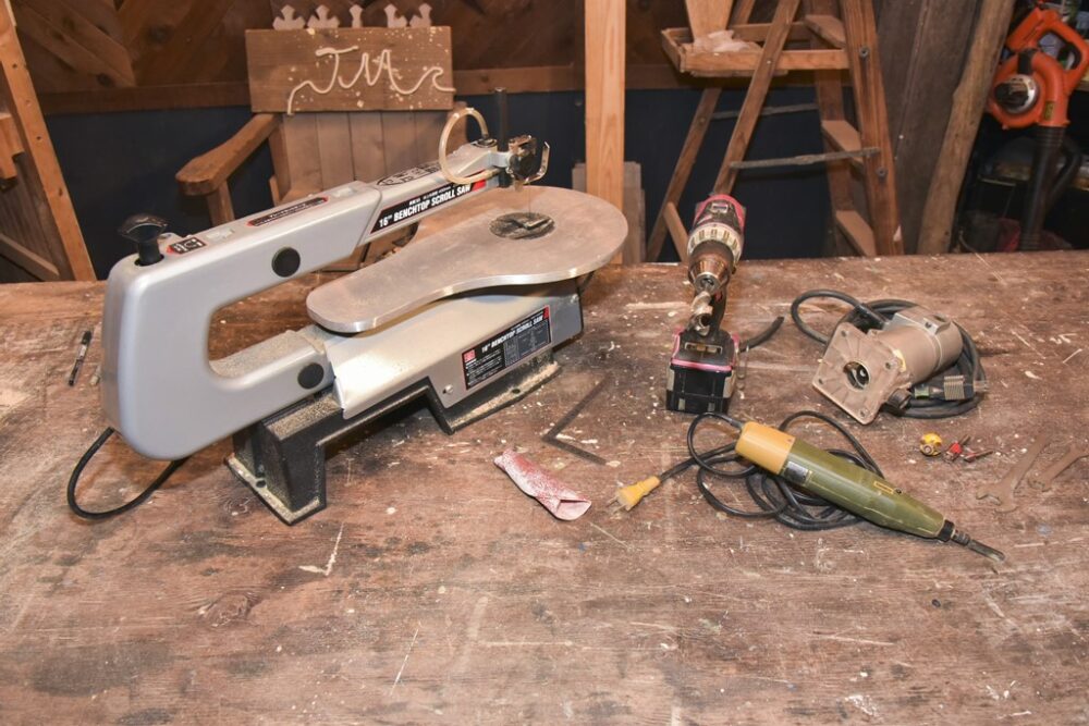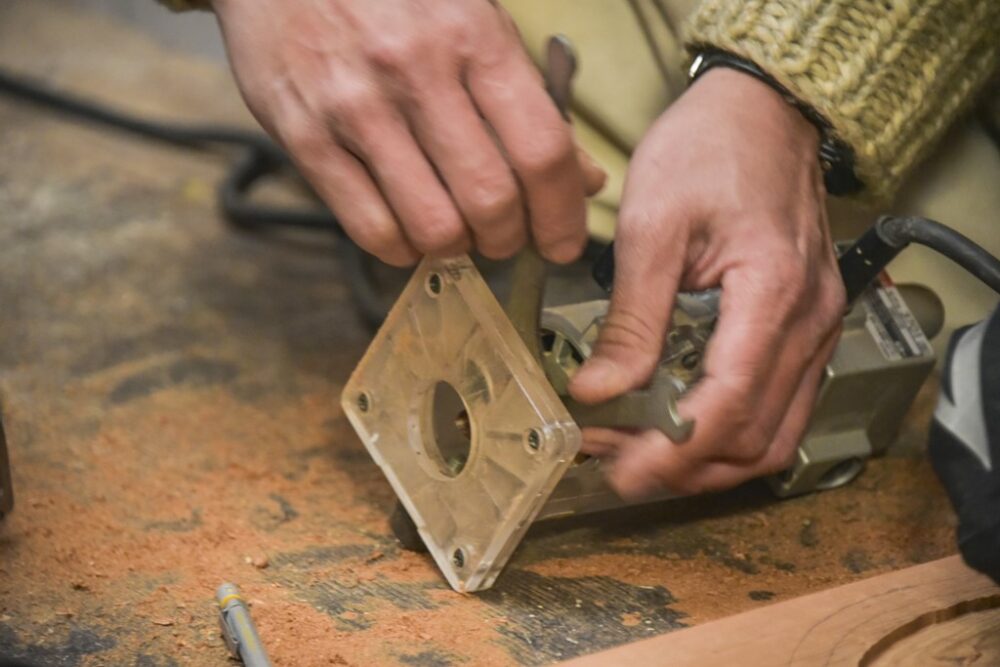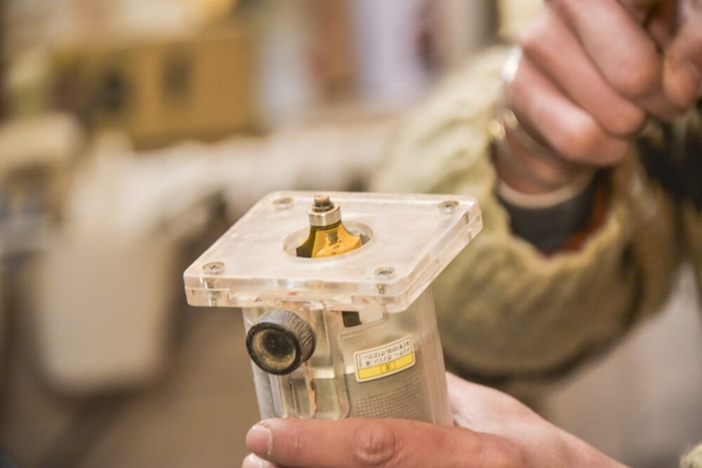 切削用の電動トリマー。内側を切削するだけでなく縁も丸く削る。ほか電動ドリル、電動彫刻刀、糸鋸を使用する。