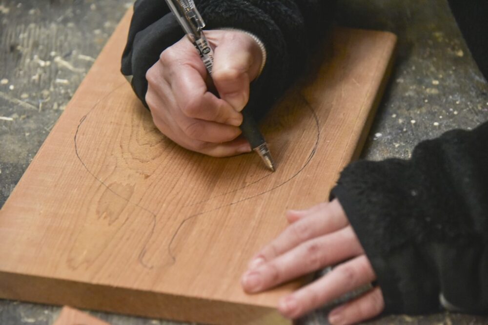 内側の縁になるところに線を引いていく。トリマーで切削する際にずれたりするので、正確な線でなくても大丈夫!