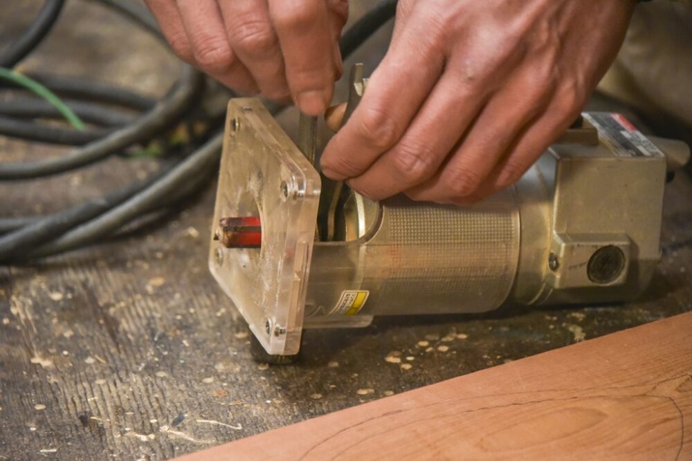次は内側の縁に溝をつける作業。電動トリマーのビットをサジ面からU溝ビット(U字型に切削できる)に交換する。