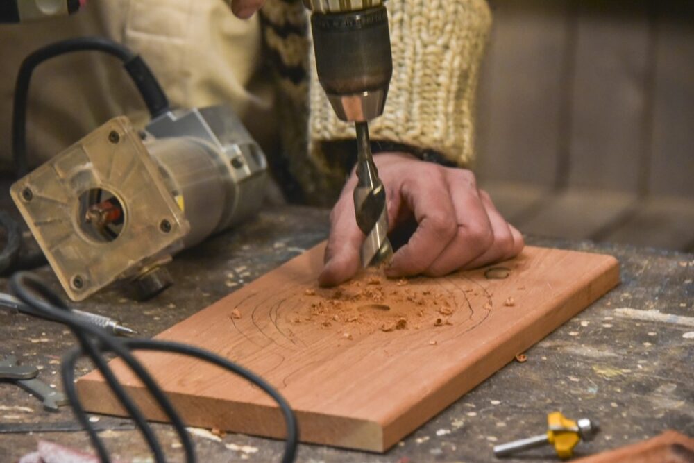 まず電動トリマーのスタート地点になる部分に穴をあける。トリマーのビットよりも大きな穴を開けるようにしよう。