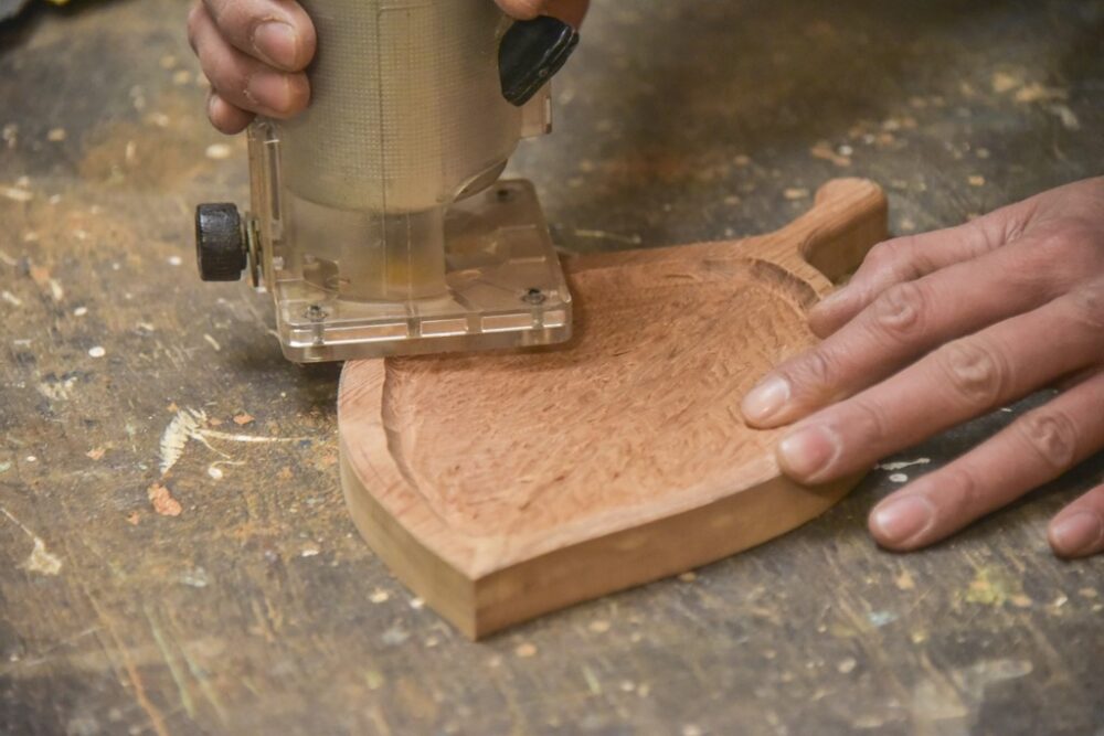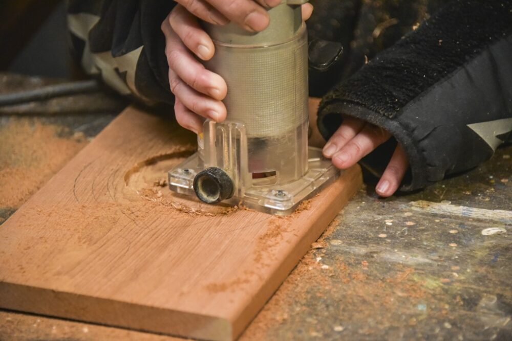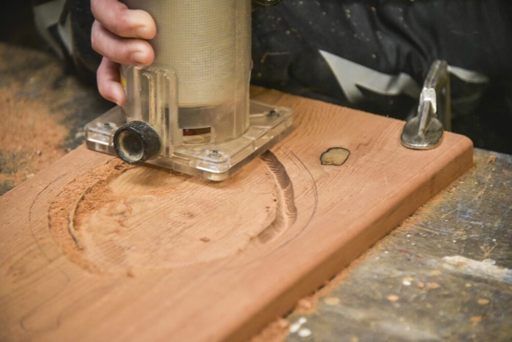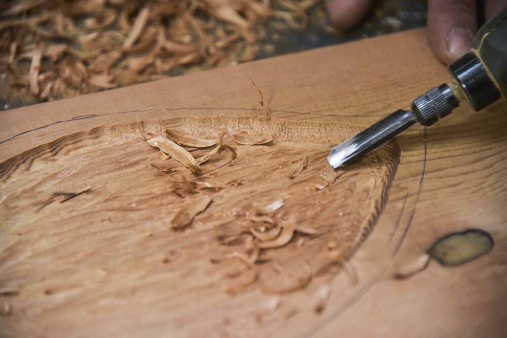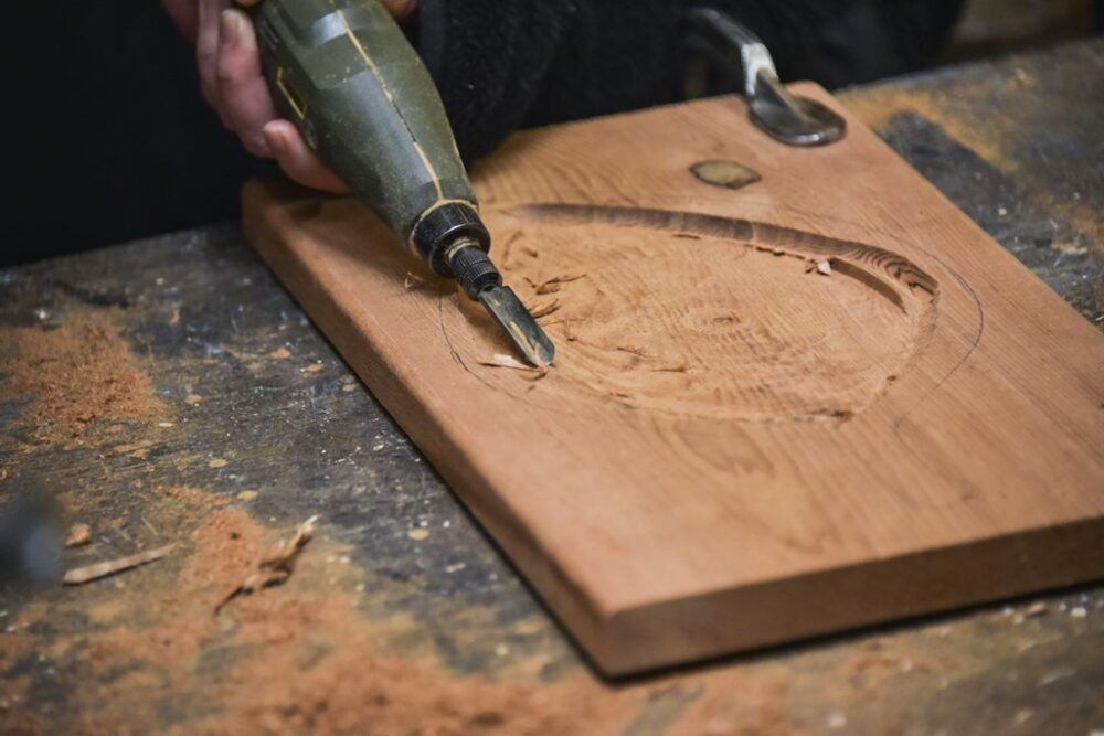 受け皿の細かい部分がガタガタになっているので、電動彫刻刀を使って少しならしていく。電動彫刻刀がない場合は、彫刻刀を使おう。