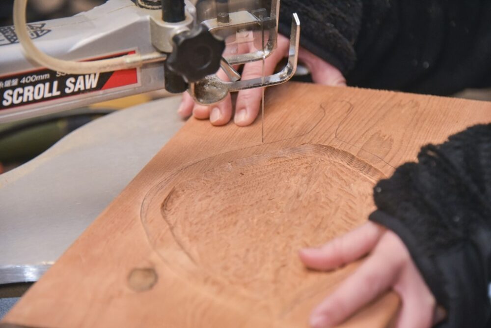 内側が大体仕上がったら、外側のラインに合わせて糸鋸で型抜きをする。