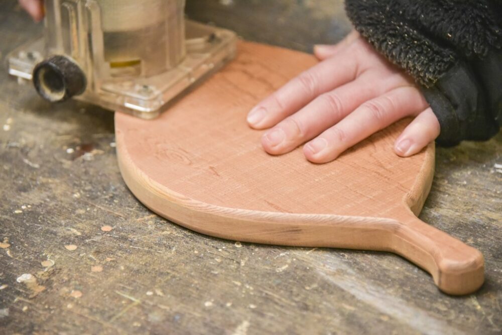 ② 縁の部分はトリマーで丸みを帯びさせ、手触りをよくする。