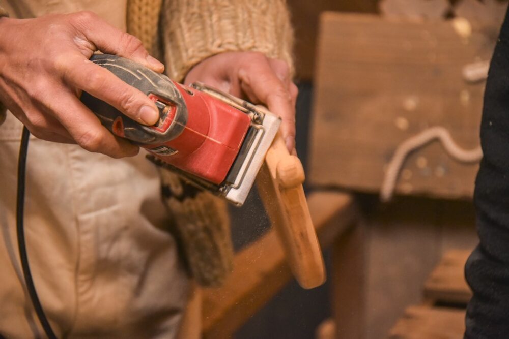 まずは電動サンダーで全体をサンディング。特にガタガタになっている部分をならし、細かい部分は紙やすりを使って手作業で研磨する。