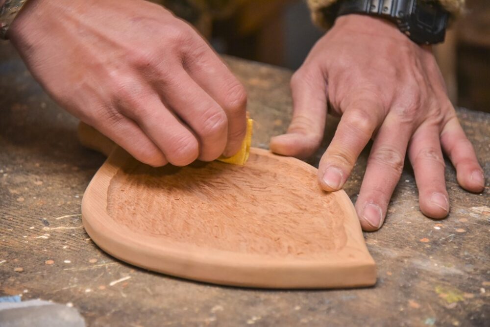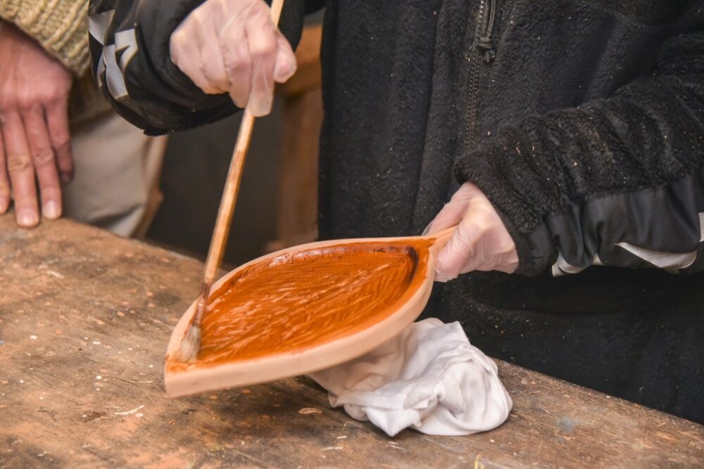最後の仕上げに使うのは定番のワトコオイル。彫刻刀の溝があるので、小さめの刷毛を使った方が細かい部分まで塗れるぞ。