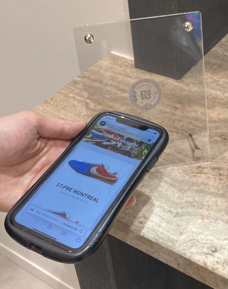 また、従来の展示はアイテムのみが主流だったが、過去に阪急メンズ東京で行われた「SNEAKER MUSEUM by KCKC」でも実施したRFIDやブロックチェーンなどのテクノロジーを活用した「読めるスニーカー」の仕組みを、より博物館をイメージした形で「スニーカーガイド」として実施している。お手持ちのスマートフォンをかざすだけで展示しているスニーカーの詳細をチェックできるので、ぜひ体験してみてほしい。