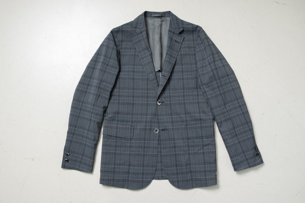 ヨコ糸にストレッチ性のあるソロテックスを使用した、天然調のドライタッチな質感に仕上げたマドラスチェック風の3ボタンジャケット。3万1900円