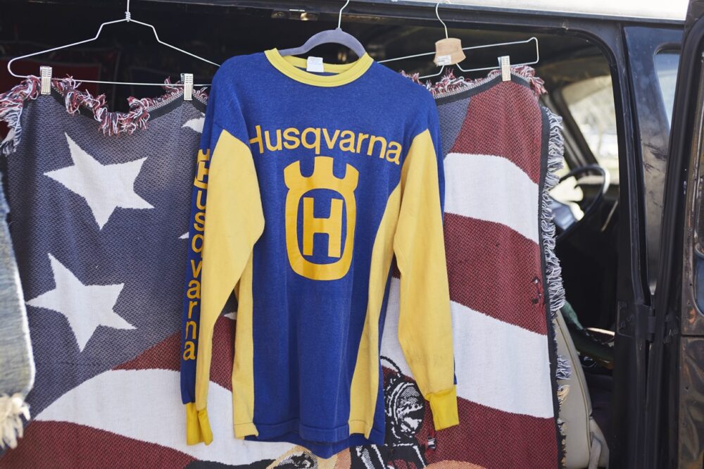 ハスクバーナ乗りなら1着は持っていたい当時のロンT。’70年代特有の光沢感のあるレーヨン製。当時は各バイクメーカーのモノが存在した。85ドル。