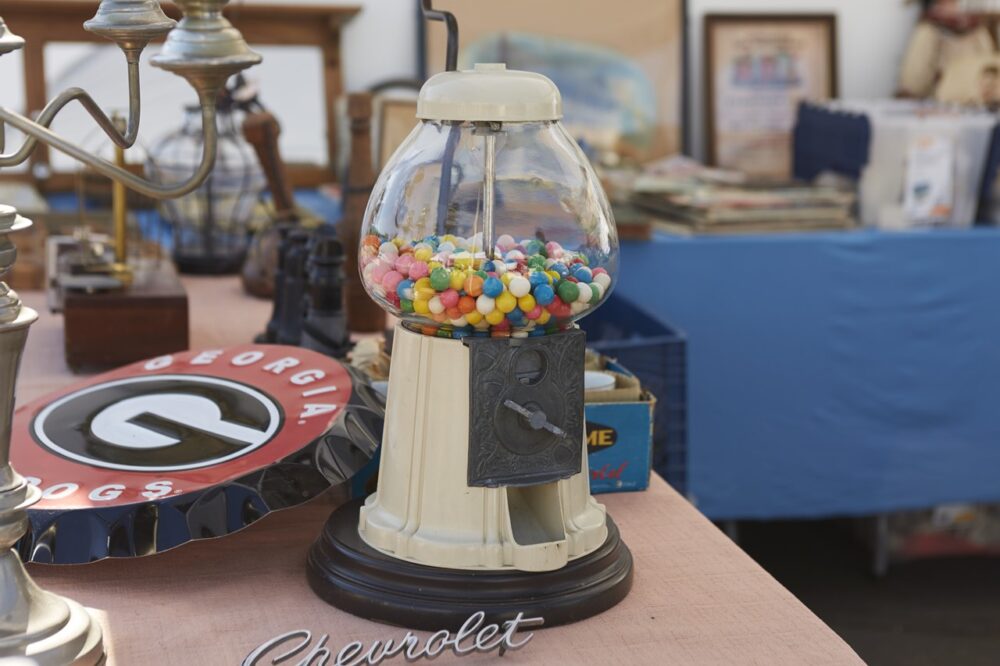 旧いベンディングマシンは金属製なので、その重厚感だけでもアンティーク好きの心を踊らせる。中身のガムはさすがに現行品である。50ドル。