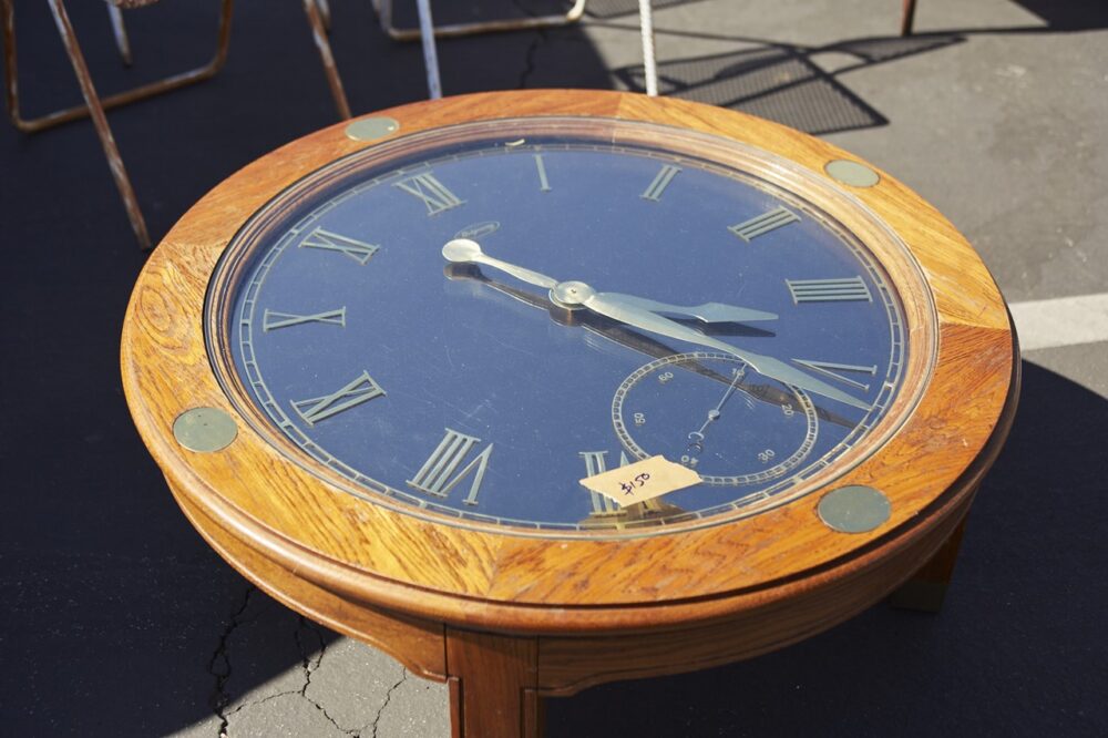 テーブルがそのまま巨大な時計になっているというアメリカっぽいファニチャー。文字盤がスモールセコンド付きでクラシカル。価格は150ドル。