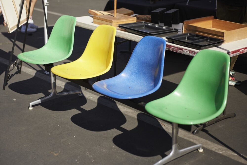 イームズのシェルチェアのなかでも豪華な4シーター連結タイプ。カラーがバラバラなので座面の年代はそろっていないかもしれない。1200ドル。