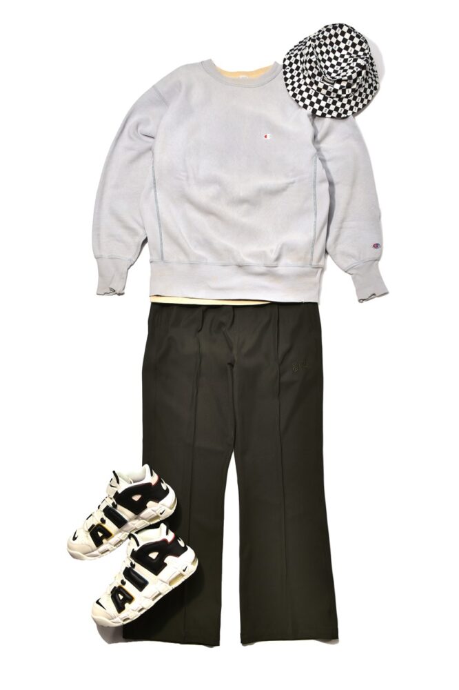 スポーティさも際立つストリートスタイルは、いまっぽいスタイルの代表格。バケットハット、オーバーサイズのスウェットシャツにジャージ素材のブーツカットパンツという、アイテムと素材の組み合わせ方がポイントだ。足元にボリューム感のあるバッシュを合わせていることも重要。これがローテクスニーカーだと雰囲気が半減する。