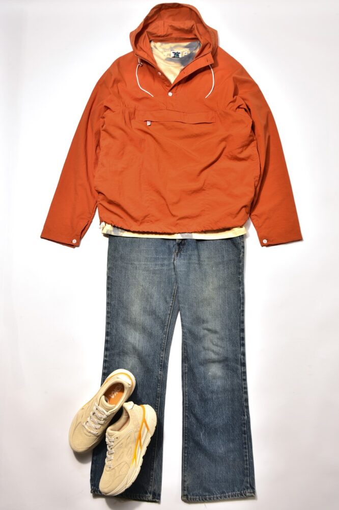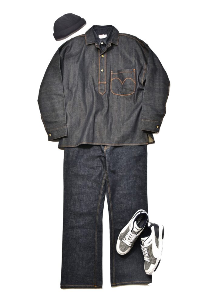 ブーツカットやフレアパンツの着こなしで、いまっぽくまとめづらいのが意外にもデニムonデニムだろう。Gジャンではなく、このようなボリューム感のあるプルオーバーのデニムジャケットがオススメ。足元には往年のバッシュを合わせると、いまっぽさをさらに演出できる。ニットキャップやメッシュキャップ、バケットハットなんかと合わせたい。