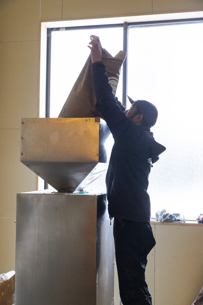 まず原料のモルトを粉砕する。一袋ずつ丁寧に機械に入れていく。粉砕の状況を見ながら、次の袋を投入……。いつもは前日に行う作業ということだが、この日は特別に行ってくれた。
