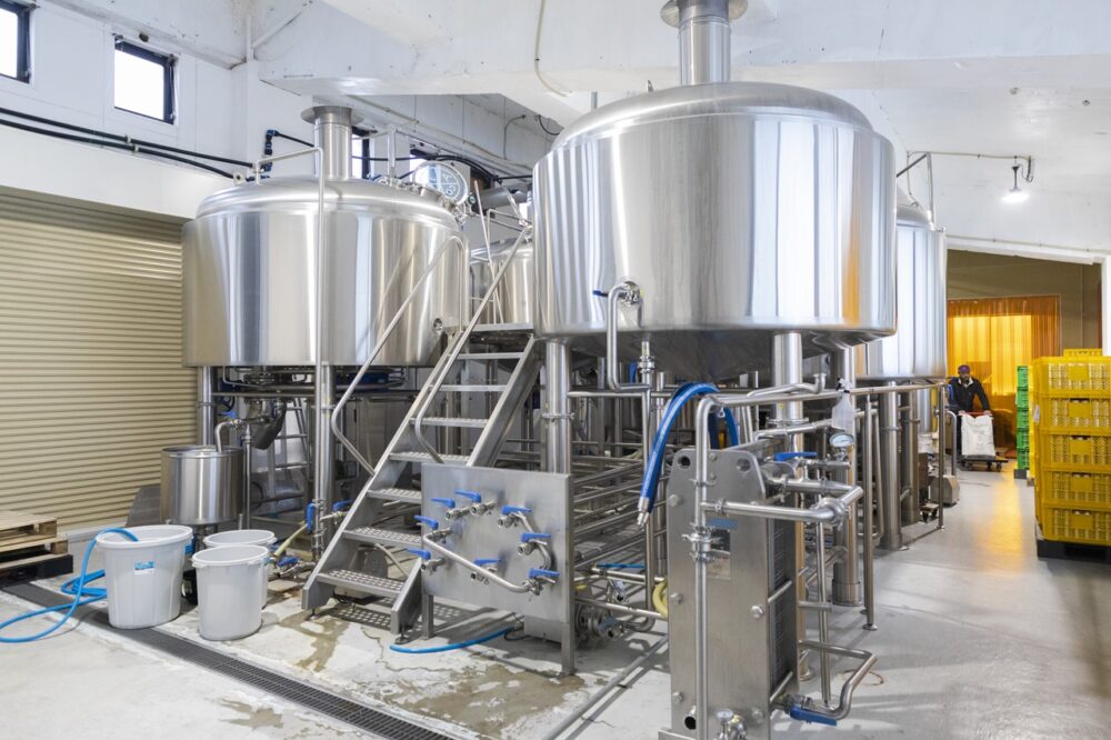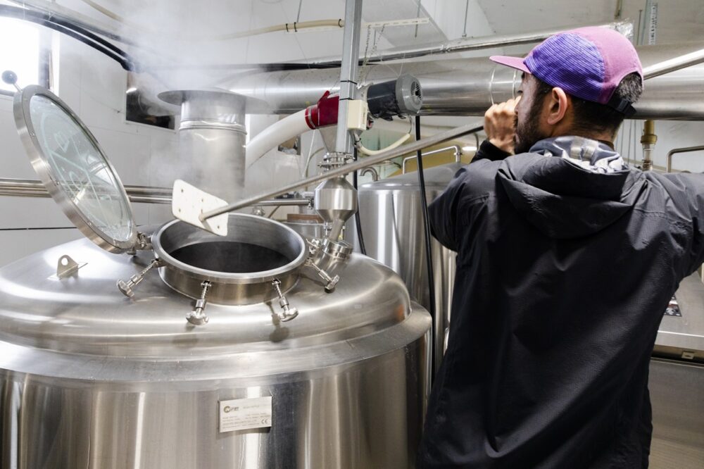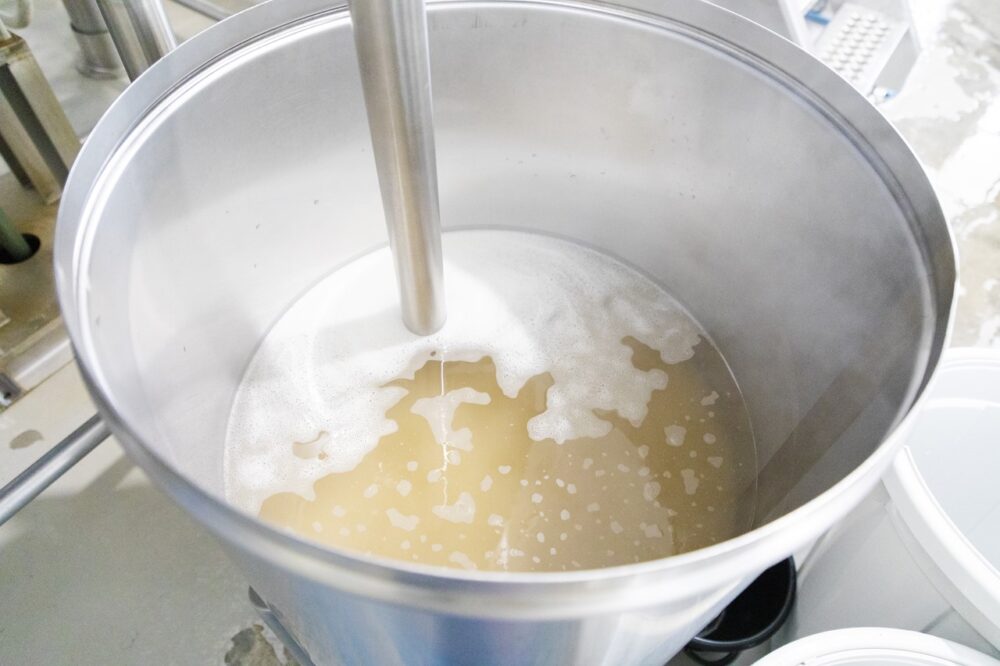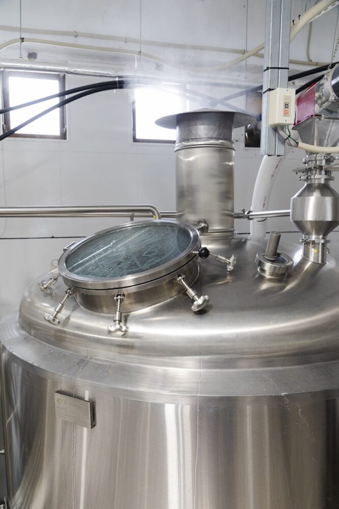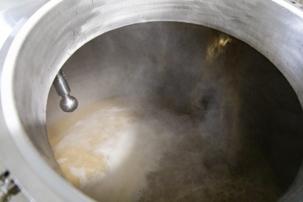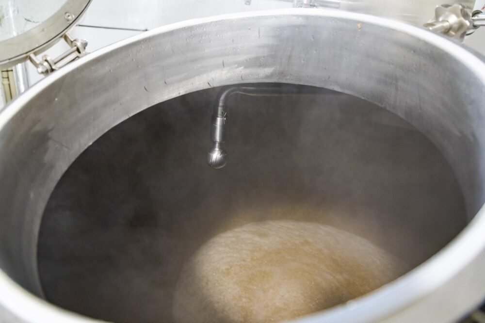 ときどきかき混ぜながら、1時間ほど煮込む。タンクにつながった筒から蒸気がモクモクと出て、ブリュワリー内の温度も少しずつ上がってきた。