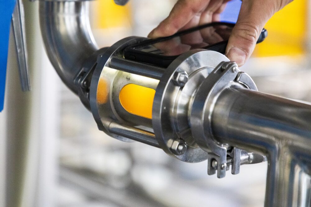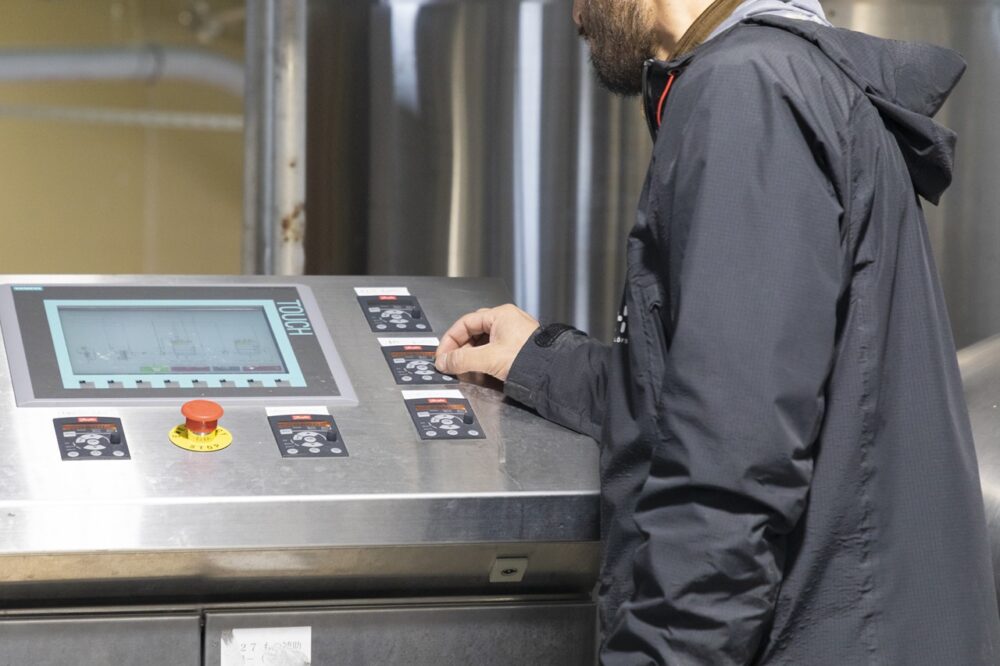 先ほど粉砕したモルトが「マッシュ」用のタンクに移動してくる。これらはすべて機械で制御しているが、製造担当の小林さんは、タンクの中の様子を常に見ながら調整していた。