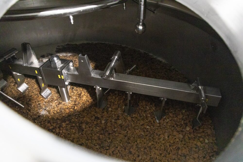 モルトが移動してきたら、60度くらいのお湯を投入して煮込む。タンクの中では湯気を立てながらモルトが撹拌されている。