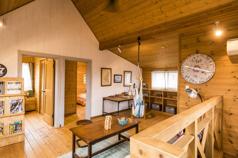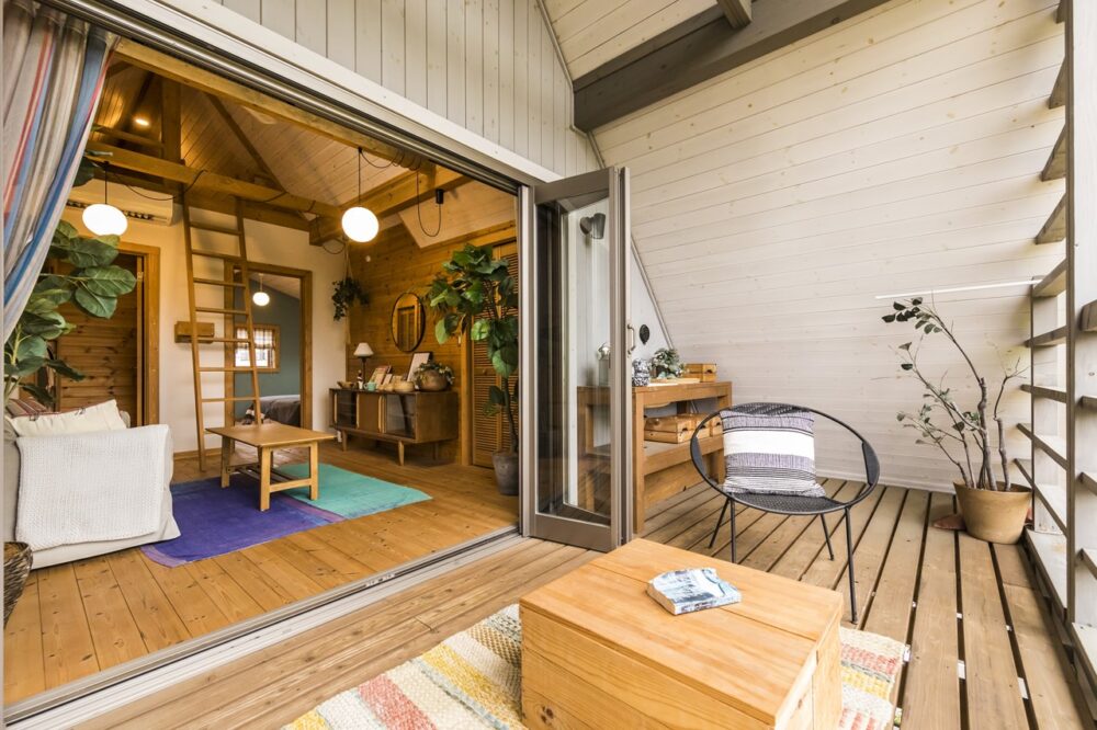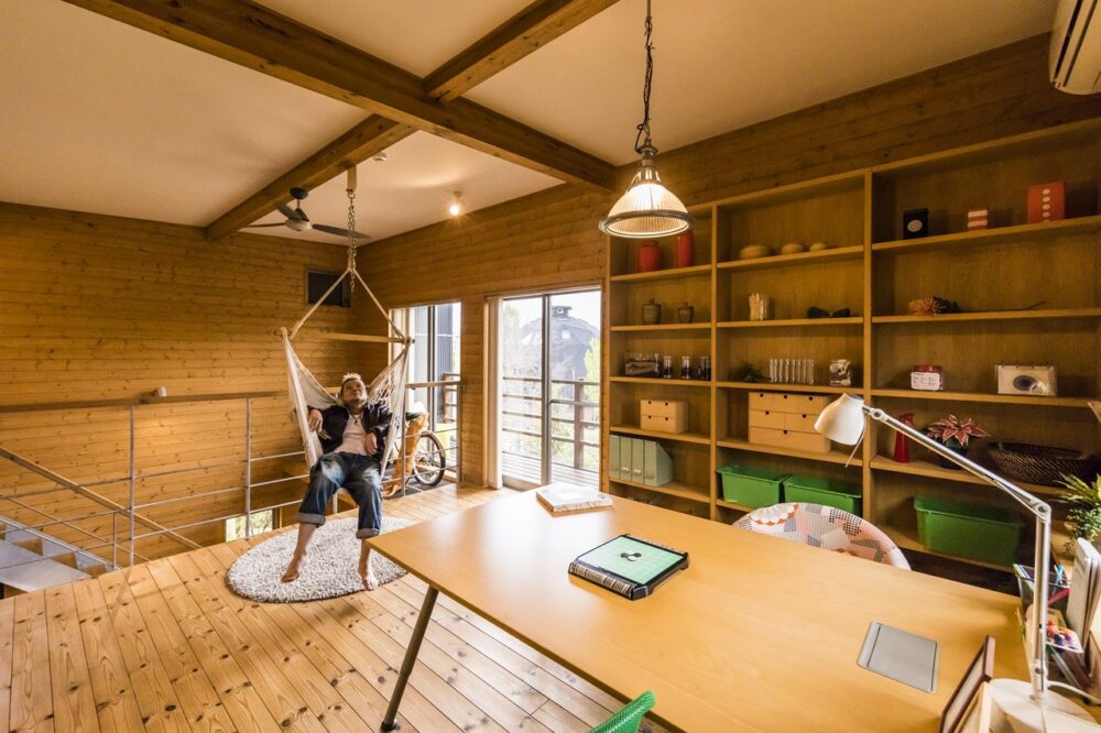アメリカのカントリーサイドに建っていそうなデザインで人気のモデル、「COUNTRY LOG」。エントランスを入ると、そこに広がるのは大きな土間空間。木に囲まれたこの土間空間を趣味に使う人も多く、アウトドアギアのメンテや自転車の整備、ヨガに使うのもいいかも。