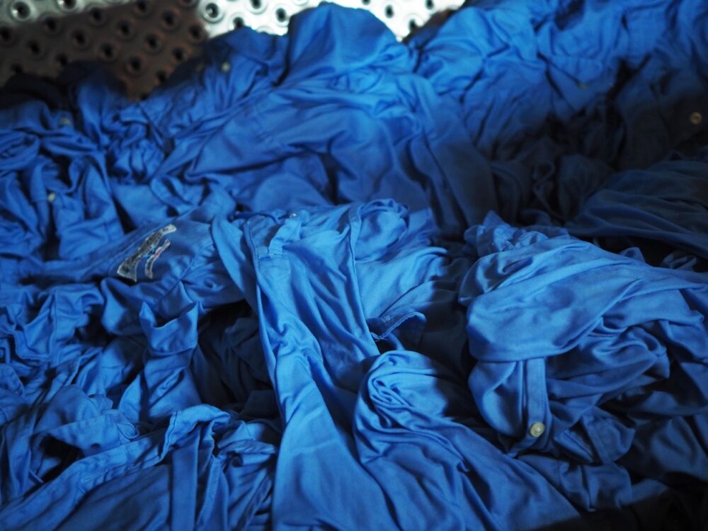 独特の風合いをもつ「横浜染め」。横浜某所の染色工場で、たったひとりの職人によって小ロットずつ作業されている。左はその作業工程。白いシャツが青く染められている。