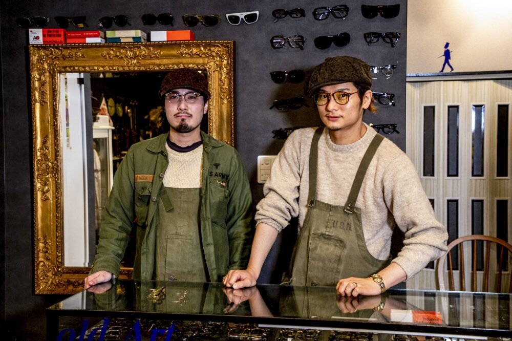 アメリカモノのみならずヨーロッパから買い付けたアイウエアのほか、カレッジリングやフリーメイソングッズ、腕時計、雑貨などを扱う「オールドアート アンティーク&ヴィンテージ」(愛知県名古屋市緑区)のふたり。アイウエアは販売だけでなくレンズの加工も行ってくれる(度なし)