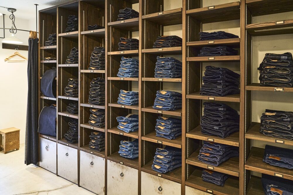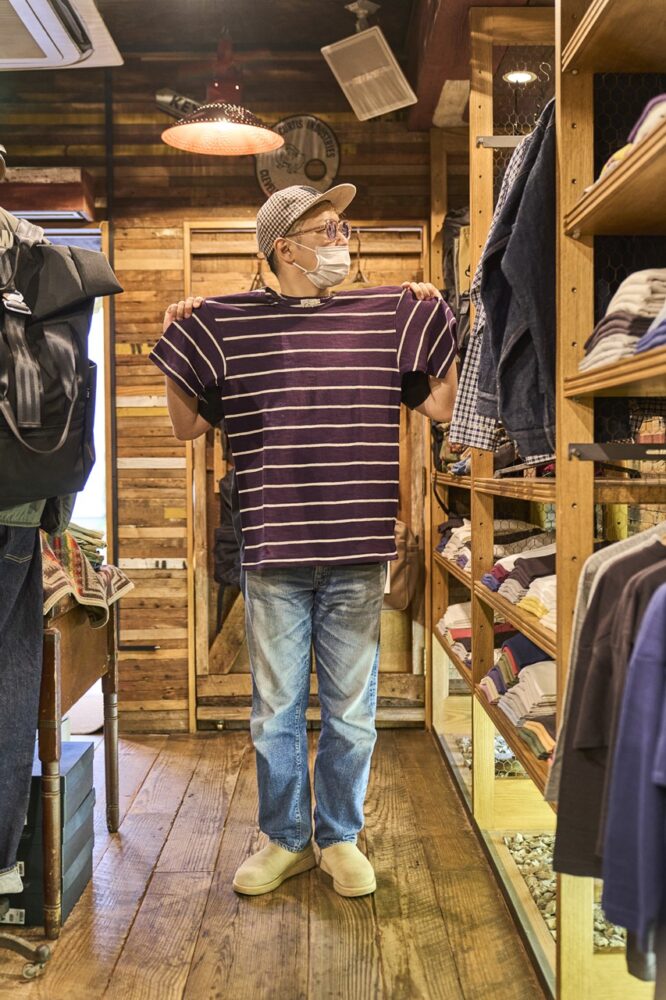デニムの聖地として世界的に知られる岡山県倉敷市児島に拠点を置くピュアブルージャパンが、原宿に構える旗艦店へGO。ブランド名のとおり“ブルー” に対するこだわりが強く、店内はインディゴ染めのプロダクツばかり。新作Tシャツはこれから入荷だそう。