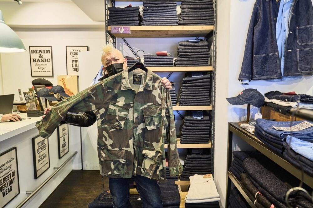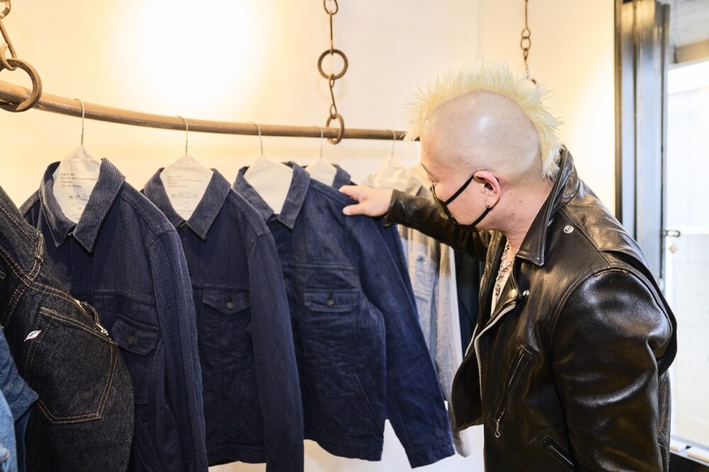 タテ糸・ヨコ糸ともに徳島の阿波正藍で手染めした糸で織ったセルビッジデニムJKT「6104」に小川も興味津々。8万8000円