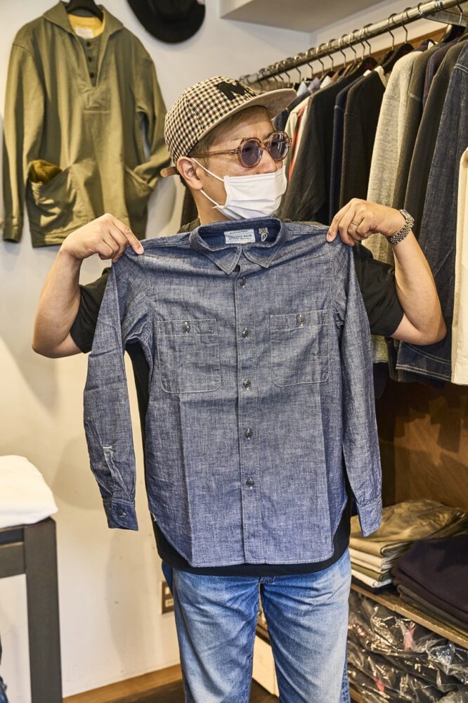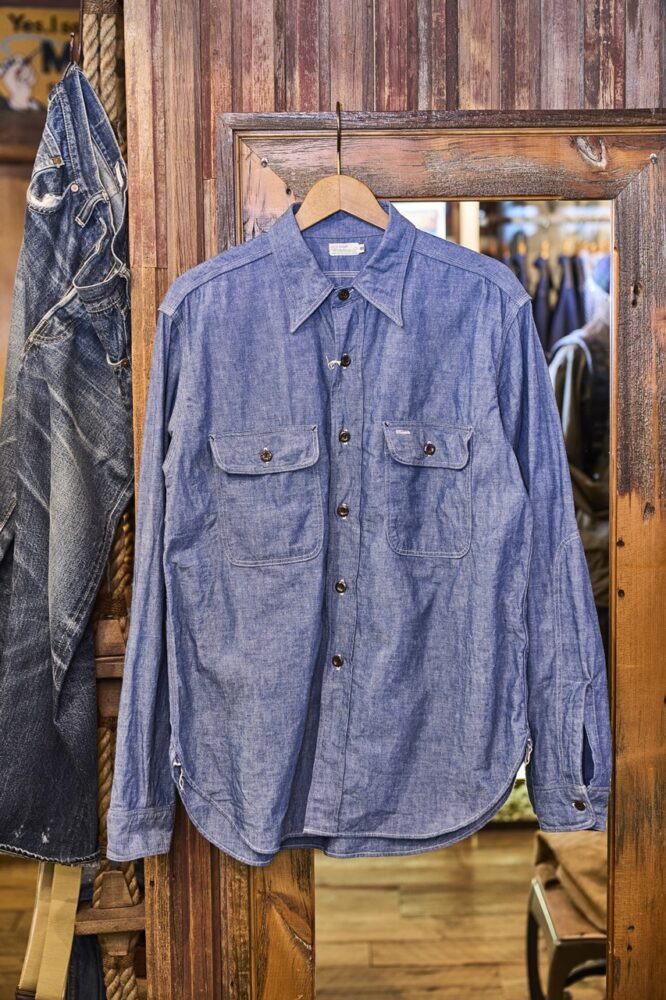 この季節に重宝するインディゴシャンブレーのUSNワークシャツはエイジングにも期待したい。Lot.4810 / 1万8480円