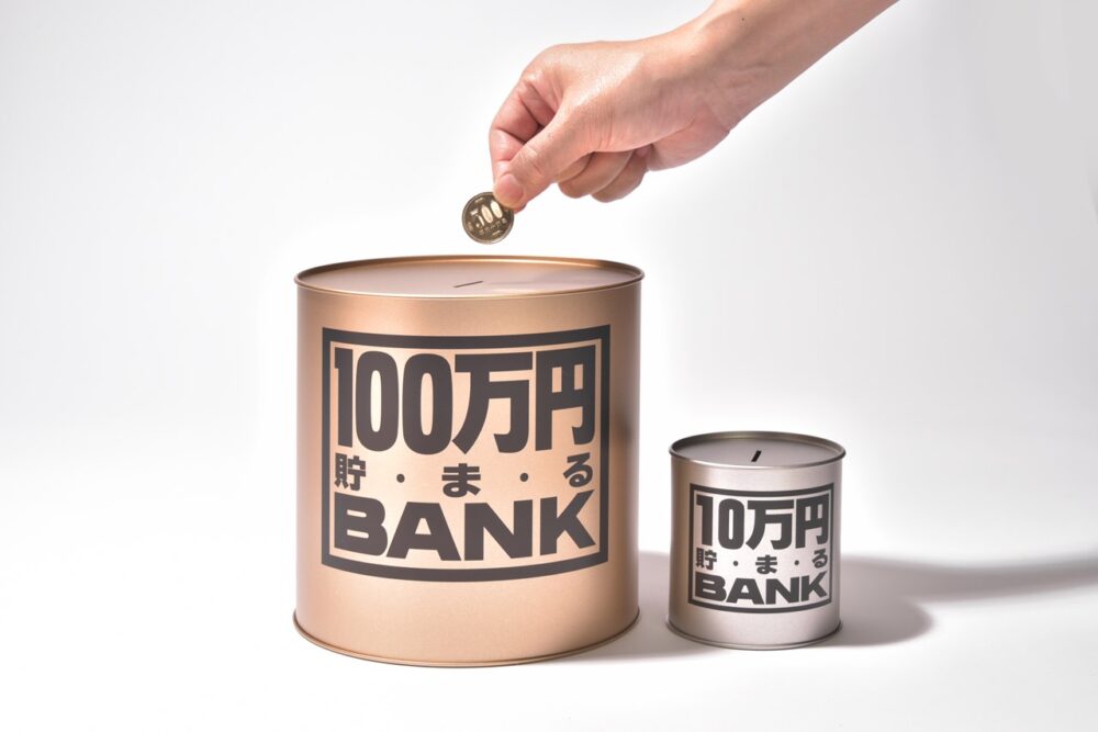 左/500円玉を入れ、満杯になると100万円に到達するという貯金箱。開けるには缶切りで蓋を開けるしかないのだから、嫌でもお金は貯まっていく? 1320円、右/「100万円はちょっと無理……」という人は、サイズダウンして10万円を目標にしてみては? このサイズなら、いつの日か達成できるかも! 495円