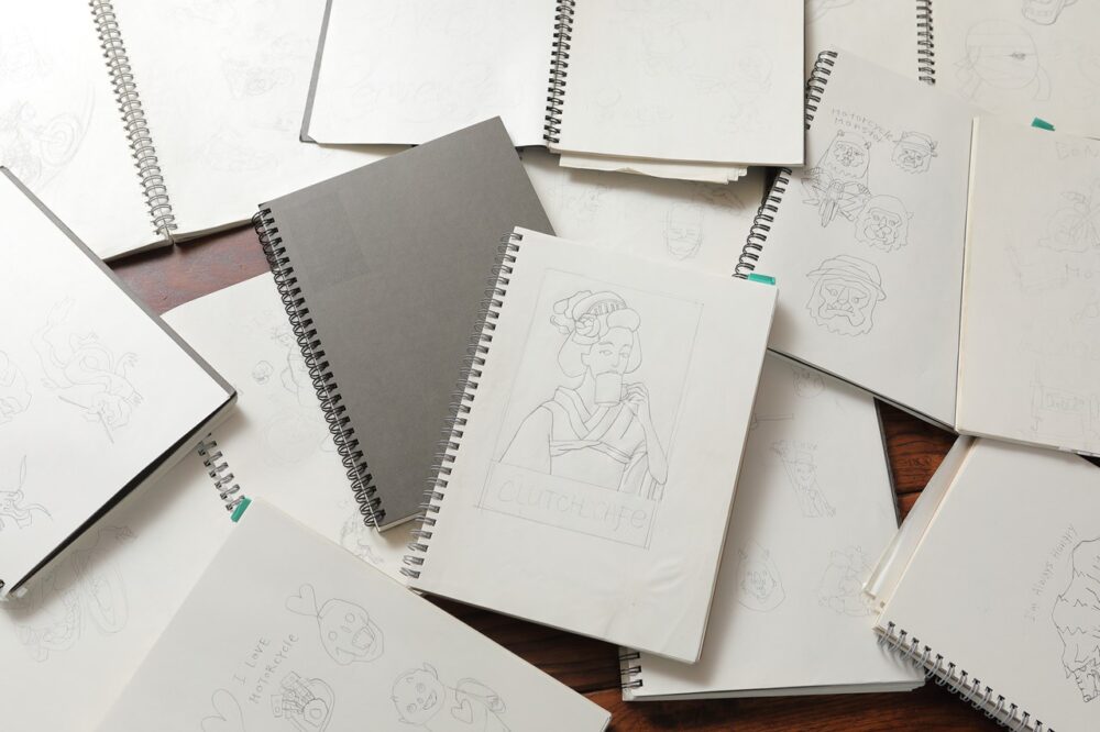 長年、グラフィックデザイナーとしての勤務歴もあることから、PCを使ったグラフィック制作には慣れているはずなのだが、あくまでも落書き。もちろん現在も手描きだ。これまでに描き貯めた落書きは、B6サイズのリングノート13冊分。手の空いた時間に過去の落書きを見ながら、おもむろに描き始めることも少なくない。