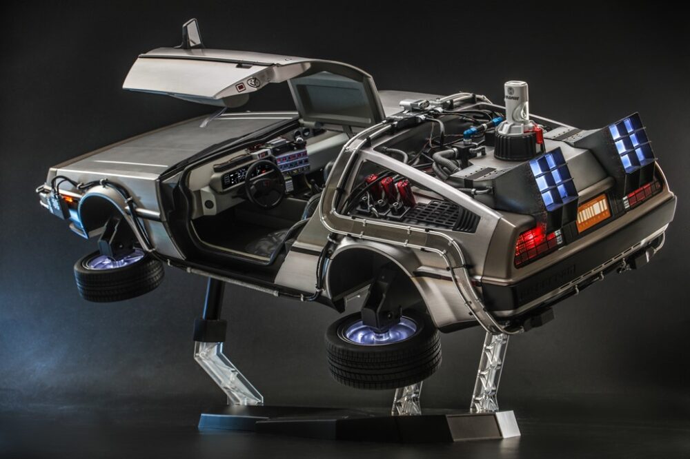 『バック・トゥ・ザ・フューチャー PART2』のデロリアン・タイムマシン。LEDライトアップ機能で劇中同様のエフェクトを楽しめる。11万円。2023年9月発売予定。