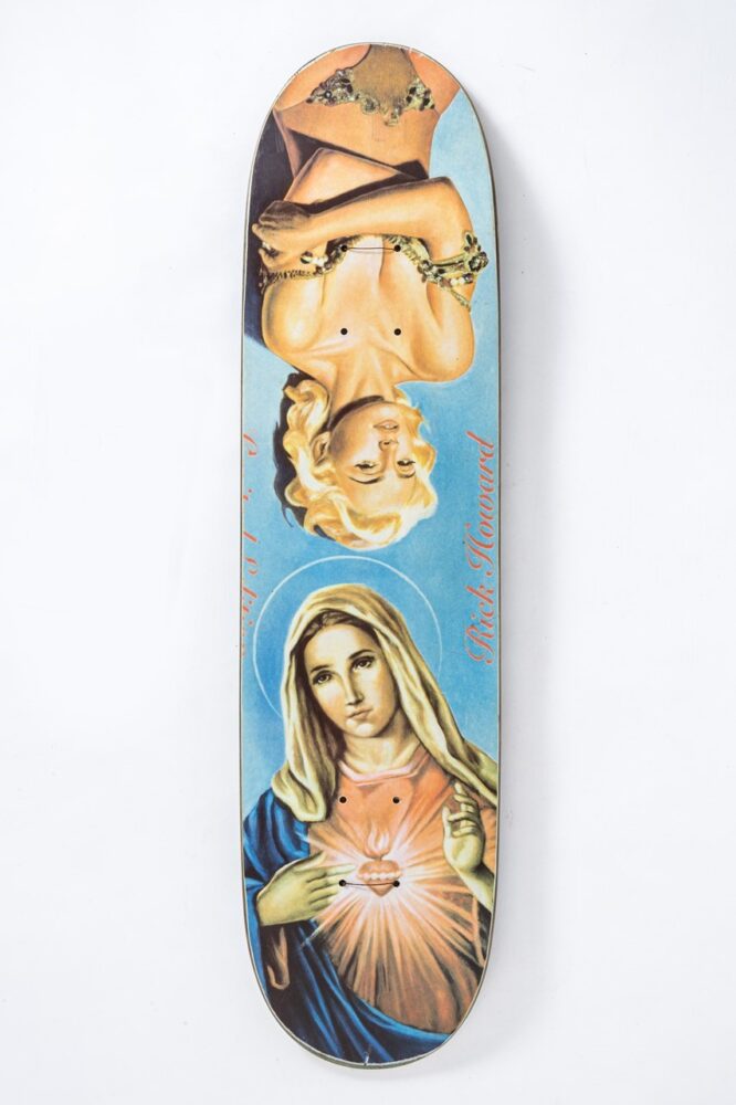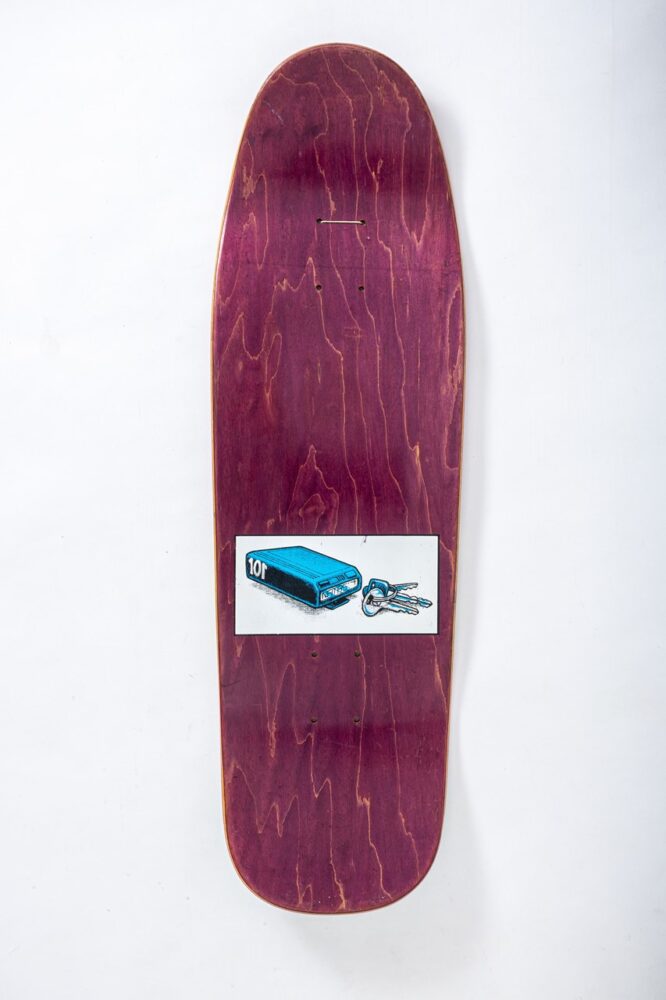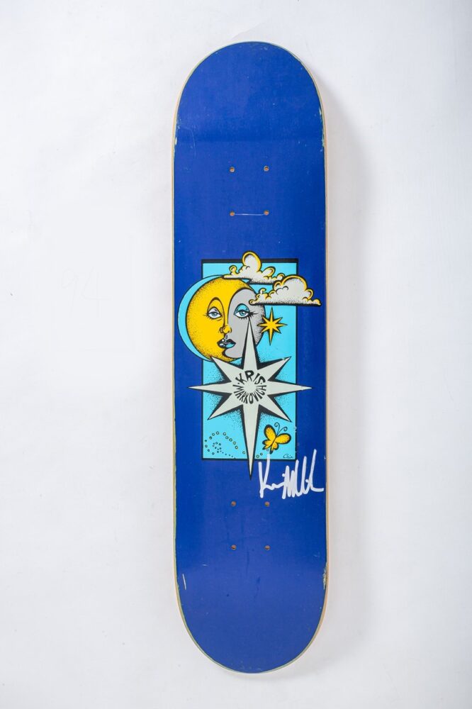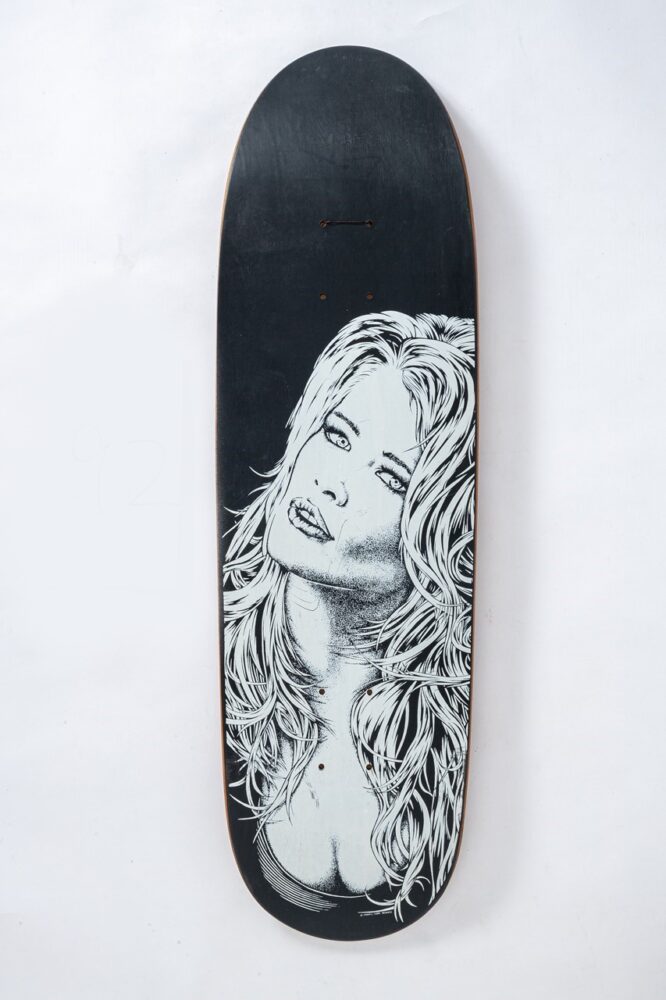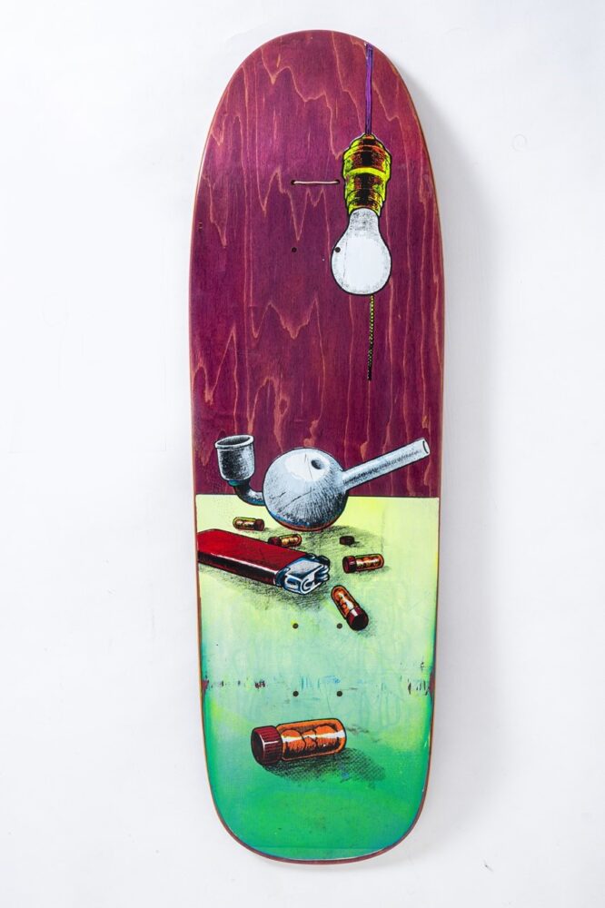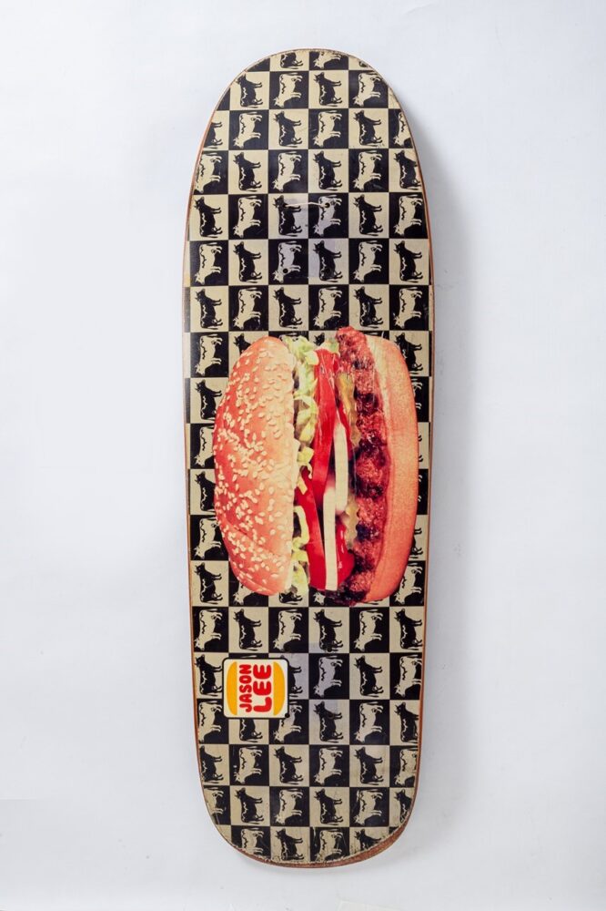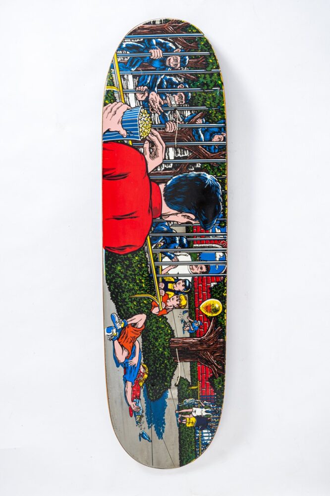 「’80年代にも有名なアーティストやグラフィックはありますが、スカルモチーフが多かったり、悪い言い方をすれば似たようなグラフィックやビジュアルばかりだったんです。それが’90 年代に入ると、ライディング技術の進化と共にストリートスケートの時代を迎え、デッキの形状もフィッシュテールからダブルキックに変わっていきました。そうした時代の変革期の真っ只中だったから、グラフィックパターンも多彩に広がっていったんです」
