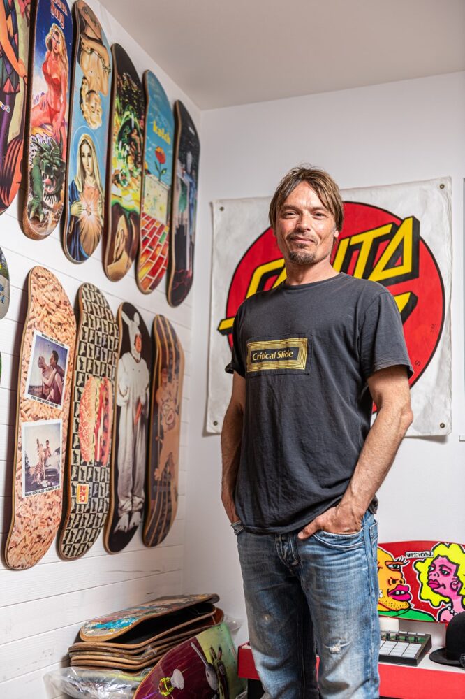 アメリカ老舗カンパニーの復刻モデル制作に、自身のコレクションを貸与するほど世界的なヴィンテージスケートボードデッキコレクターとして知られるローランさん。最近は’90年代初期のグラフィックがお気に入りだと話す。