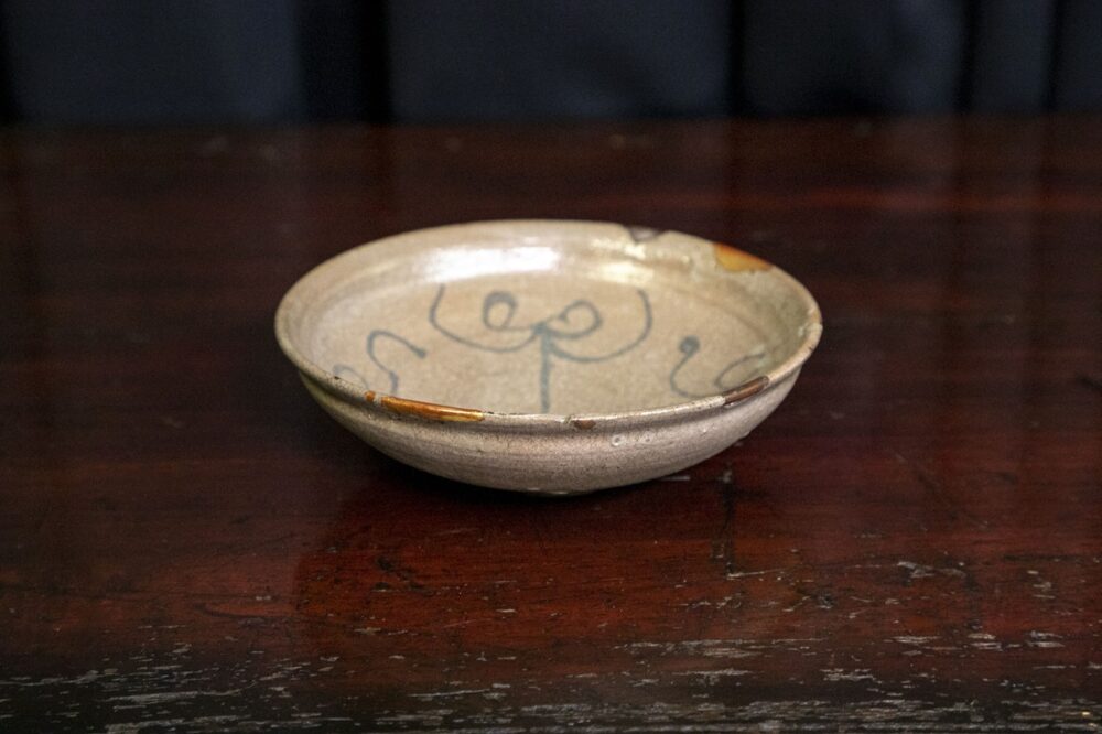 桃山~江戸初期あたりと目される絵唐津の平茶碗。お皿のような形状が特徴の平茶碗は主に夏に用いられる茶碗。独特の絵付けと口を付ける器の縁の部分、口縁の形状も美しい。また何箇所か赤や黒の漆で継がれている部分もあるがそれもまた景色になっている。