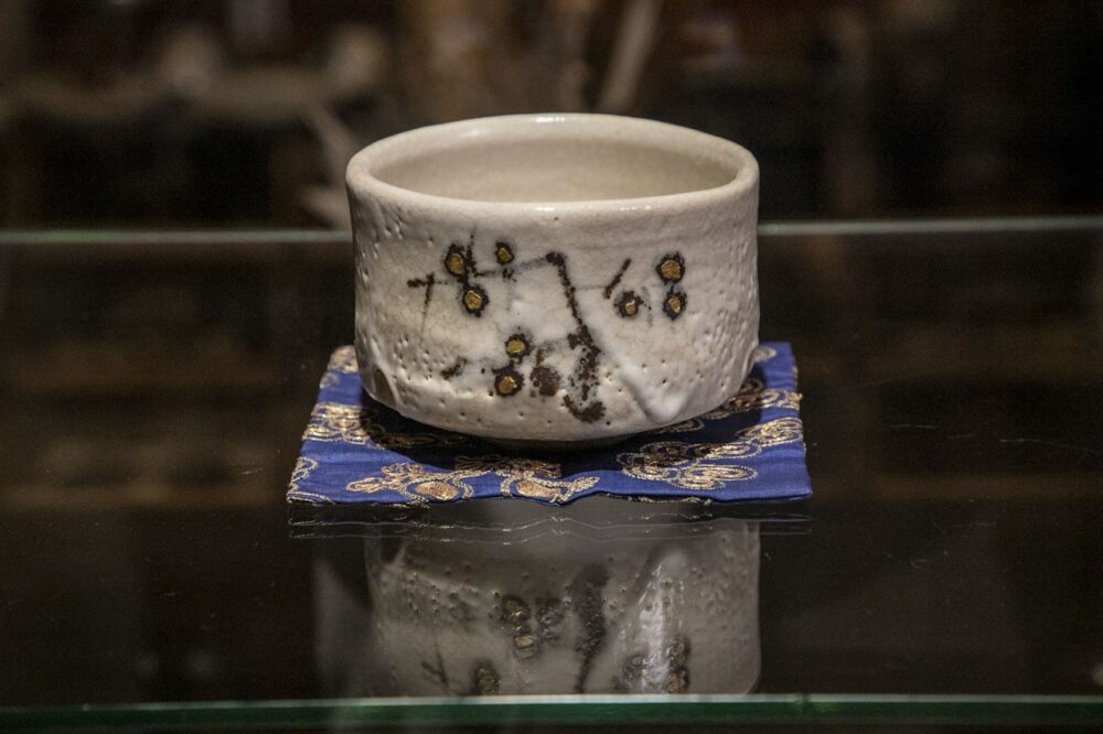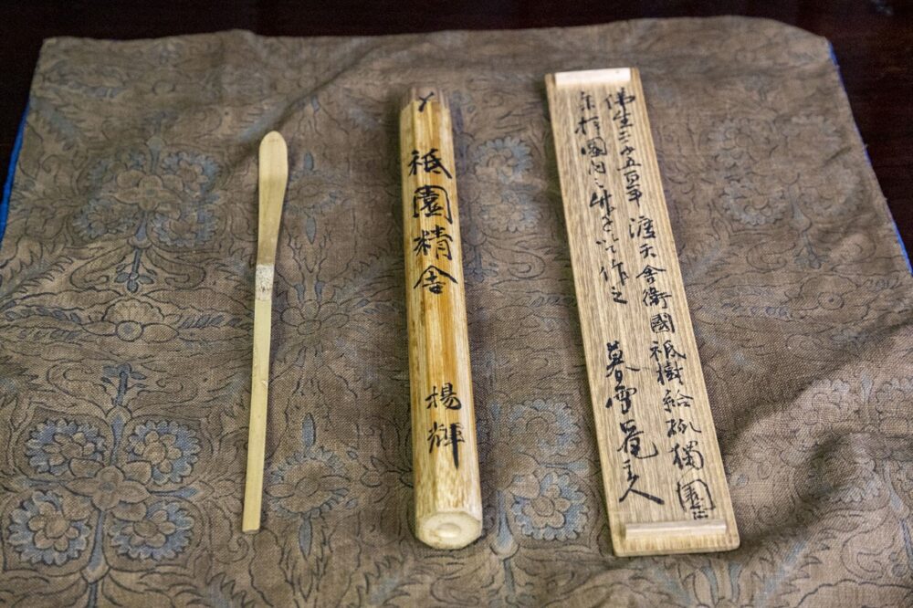 韓国で作られた高麗茶碗の一種・御本茶碗と、裏千家14代淡々斎(たんたんさい)作の茶杓・一葉、そして、明治から昭和に活躍した日本画家・山元春挙が絵付けした香を収納する香合(こうごう)。
