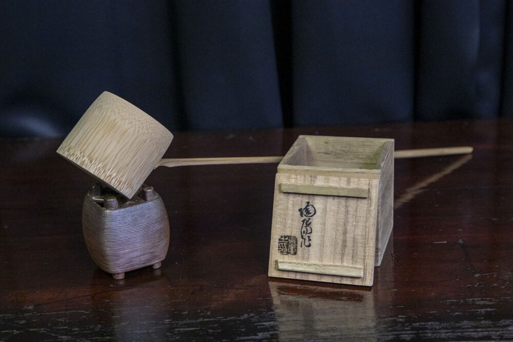 釜のお湯をすくう柄杓の合(ごう)や釜の蓋を置く蓋置。こちらは明治29年岡山県出身の陶芸家で、肥前焼の陶工として始めて人間国宝となった金重陶陽が昭和7年あたりに手がけた作。本人の手による箱書きと落款が入る。