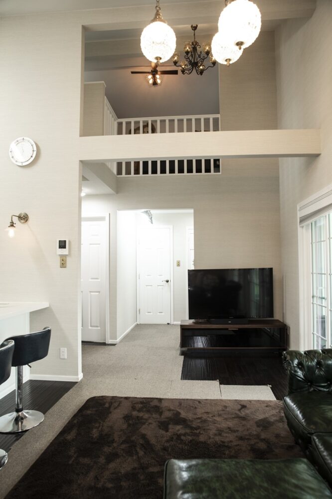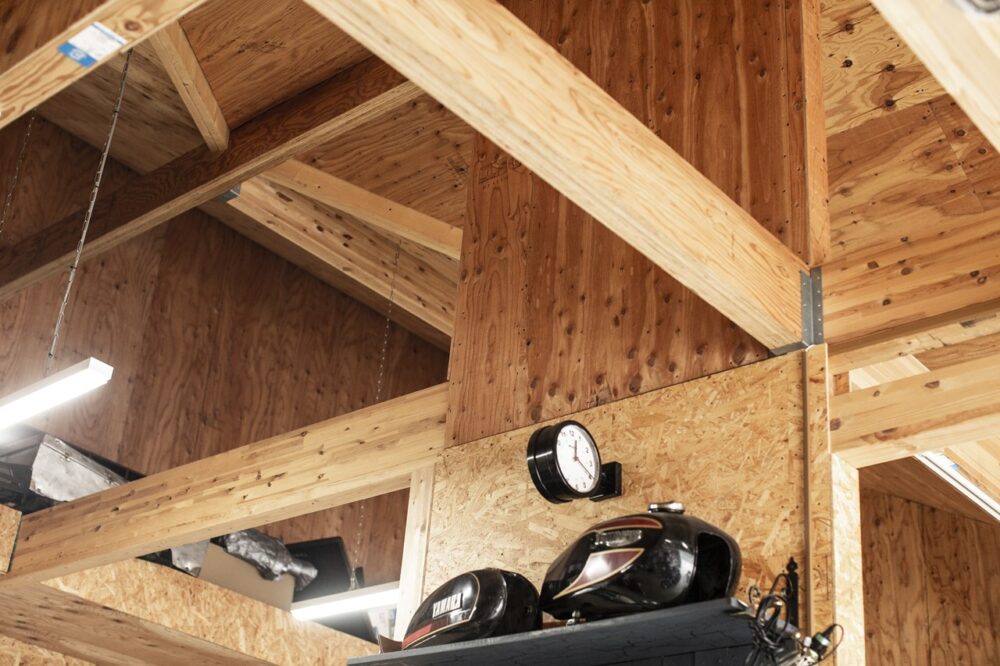 ガレージは梁を剥き出しにして、天井を高く設計することで開放的な空間になっている。