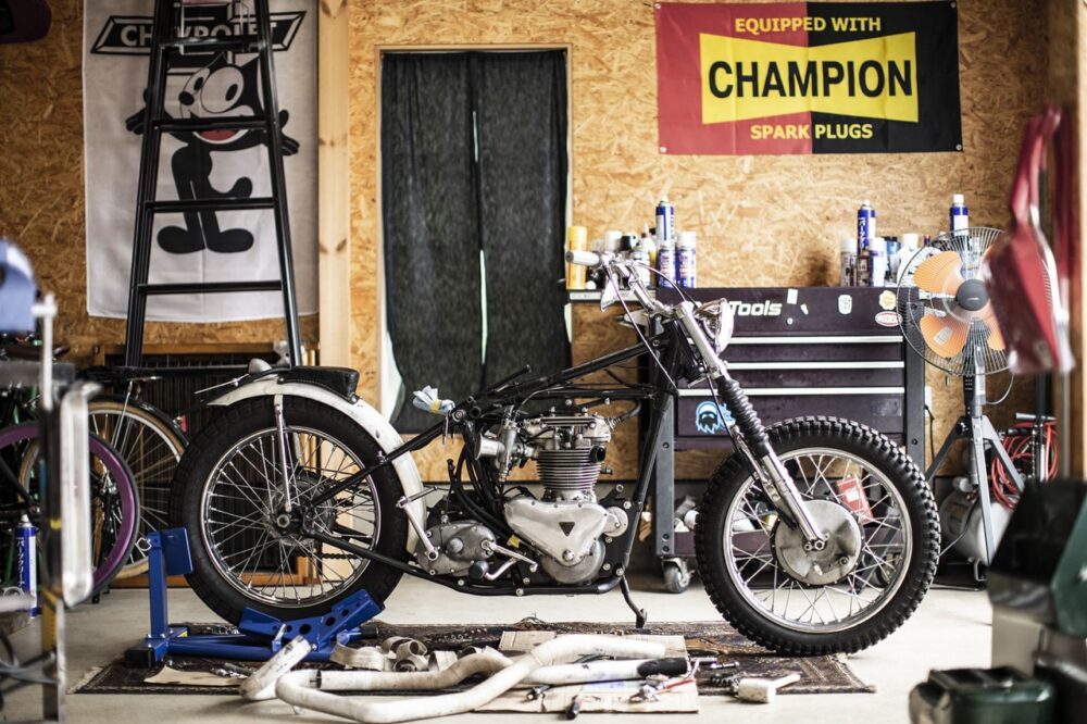 というのも、実は奥さんも現在草レースに向けてヴィンテージトライアンフを制作しているという根っからの趣味人。ガレージは夫婦の趣味が詰まった空間なのだ。