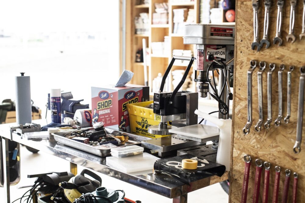 愛車の整備はできることは自分でやるスタイルなので、基本的な工具は揃っている。ボール盤やプレス機などは、レザー小物の制作にも使っているのだとか。