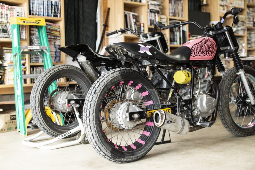 壁一面に設置された本棚には漫画や雑誌がずらりと並ぶ(ほぼ漫画)。見た目重視のガレージであればパーツやアートなどで飾りたいところだが、乗り物と同様に趣味のひとつである漫画や雑誌で埋め尽くすのが岡田さんの自然体なのだ。手前の2台のバイクはフラットトラック用のレーサー。