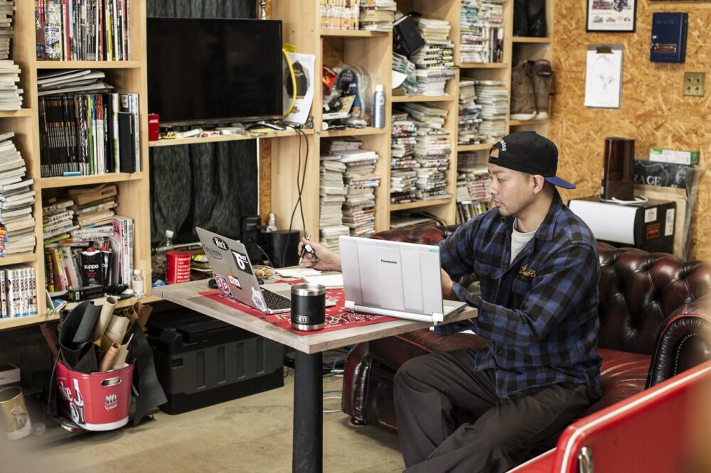 バイクや漫画、トレーニングスペースがあるガレージは男の理想の遊び場だが、実は岡田さんの仕事スペースでもある。仕事場にしては誘惑が多すぎる……