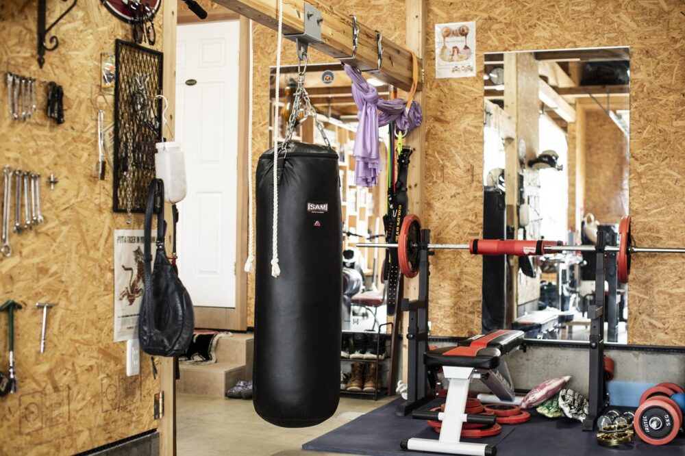 ガレージ内に設けられた筋トレスペース。空手歴30年以上のベテランだけに、日々のトレーニングも欠かせない。