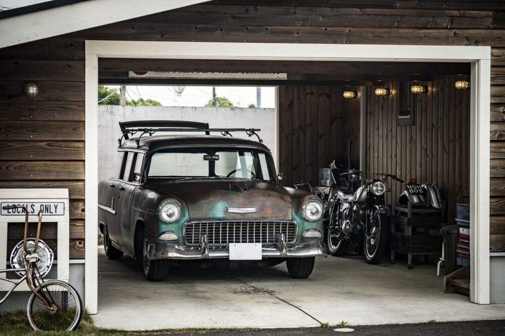 白いコンクリートの壁に囲まれたスペースに佇む、ウッドの質感が際立つ平屋。ガレージに格納された’50年代のクルマがマッチしたアメリカンな空間だ。