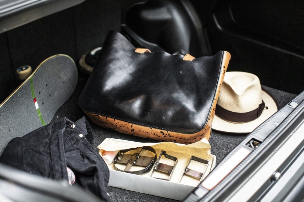 コンパクトな車格の割にトランクは広々としているため、仕事道具の他に着替えやクルマを降りた後のちょっとした移動で使うスケートボードを収納。