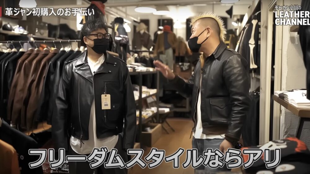 革ジャンデビューをモヒカン小川のアテンド付きで購入するなんて、なんて羨ましいお膳立て。モーターサイクルブランドのBucoやフライトジャケットなど、モヒカン小川が手取り足取り解説。初めは自分の好みすらわからない状態だった齋藤さんも、試着を繰り返すうちに、好みのデザインが徐々に明確になっていくところも見どころ!