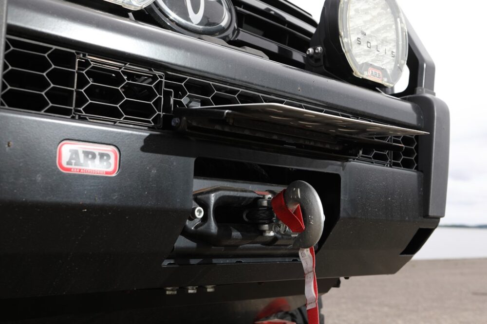 ARB4x4アクセサリーズのキャリアの前後にはLEDの照明を装着。早朝や夜でも細かな作業や準備をするためにはマストな装備である。ドロなどにハマった際に使えるウィンチも後付けした。