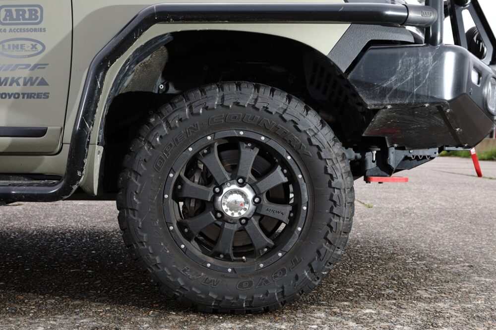 ホイールはアメリカのMKWのMK-46をグリティーフィニッシュというスペシャルな塗装で仕上げている。湿地に入ることも珍しくないのでマッドテレーンタイヤを履く。