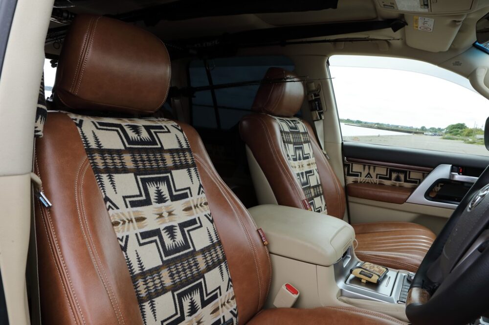 本来はファブリックだったが、レザーとペンドルトンのラグを贅沢に使っている。またドアの内張りにもペンドルトンを使うなど、個性的な空間に仕上がっている。