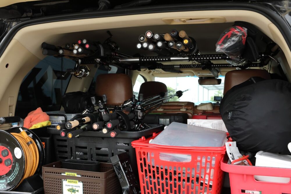商売道具でもあるロッドは様々なシーンで使い分けるために数十本を常にストックしている。他にも細かな道具がたくさんあるので、トランクスペースもカスタムされている。