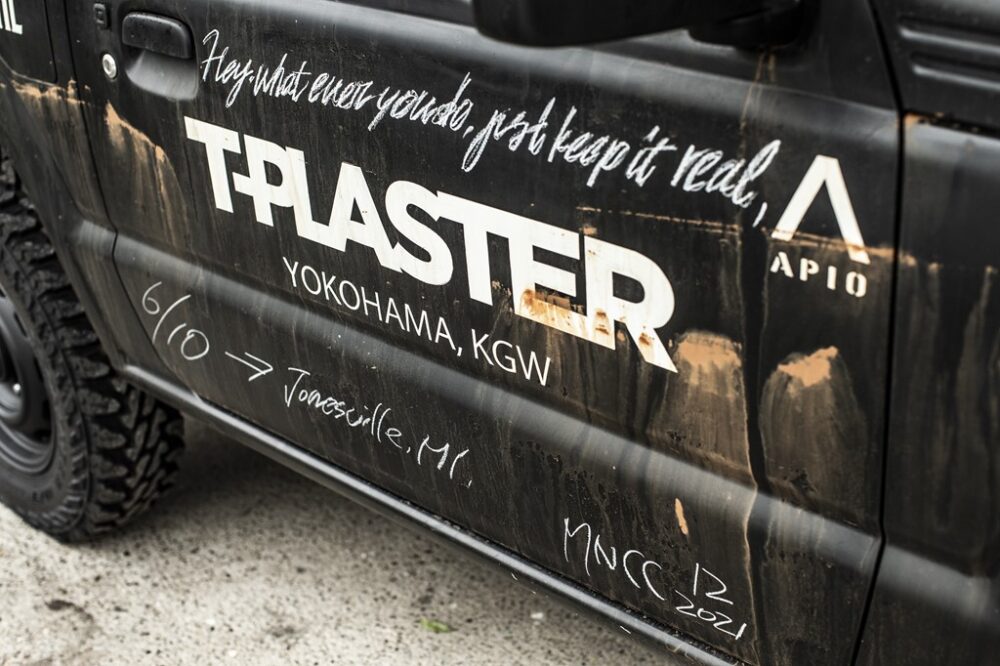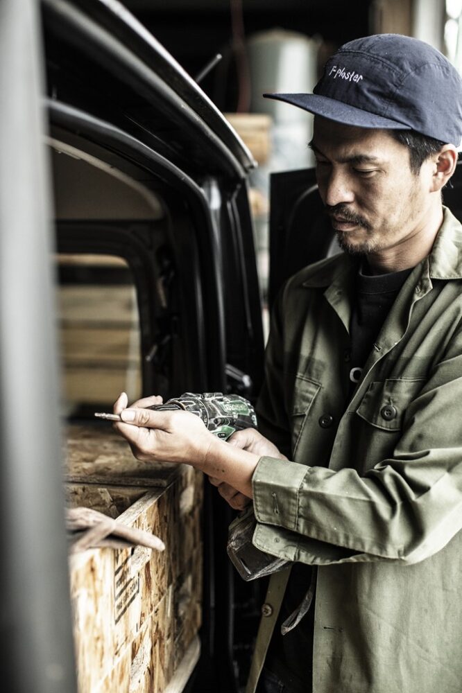 水口さんの愛車であり、ティープラスターの営業車としても活躍するこのジムニーは、現行のJB64にアピオのコンプリートパッケージである“TS4”をベースとしたカスタムを施した1台。特徴的なグリルやバンパー、インテリアのカスタムに加え、現場仕事での実用性を考慮したキャリアを装備し、ラゲッジスペースには専用設計の木製棚を設置。そして長年の付き合いで気心知れたペイントファクトリーによるエイジングペイントでフィニッシュ。安心感のある現行ジムニーをベースに唯一無二の存在感に仕上げられている。